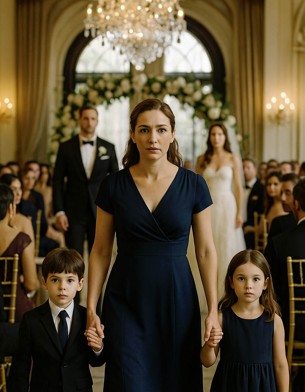 Soudain, il la vit : Léa, vêtue d’une robe marine d’une élégante sobriété, coiffure discrète… et deux enfants jumeaux lui tenant la main.