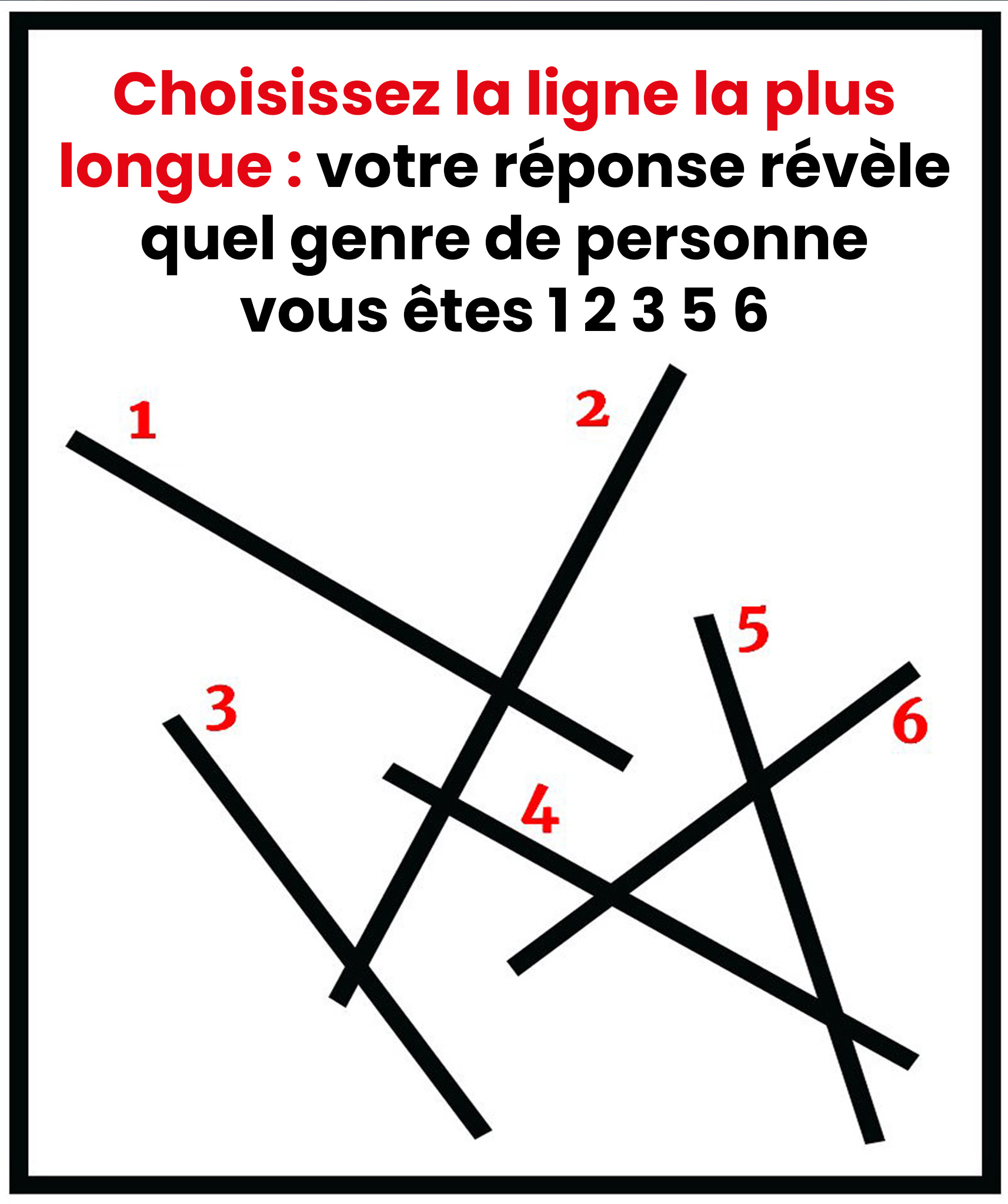 Ce test optique élémentaire, composé de six segments linéaires, dévoile des informations surprenantes concernant votre psychologie. Votre préférence spontanée éclaire votre vision particulière de l'existence et vos dispositions intimes. Souhaitez-vous explorer ce que cette désignation dévoile sur votre identité profonde ?
