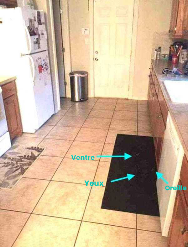 Bienvenue dans le domaine de la perception gestaltiste : notre esprit perçoit d’abord l’ensemble avant de s’attarder sur les détails. Dans cette scène, il « voit » une cuisine ordonnée et homogène ; un grand aplat sombre est interprété comme étant « le tapis », et tout ce qui s’y fond devient invisible. C’est le même mécanisme qui nous fait parfois manquer un ami en manteau noir à la sortie du métro : notre cerveau privilégie la cohérence générale plutôt que la détection des anomalies.